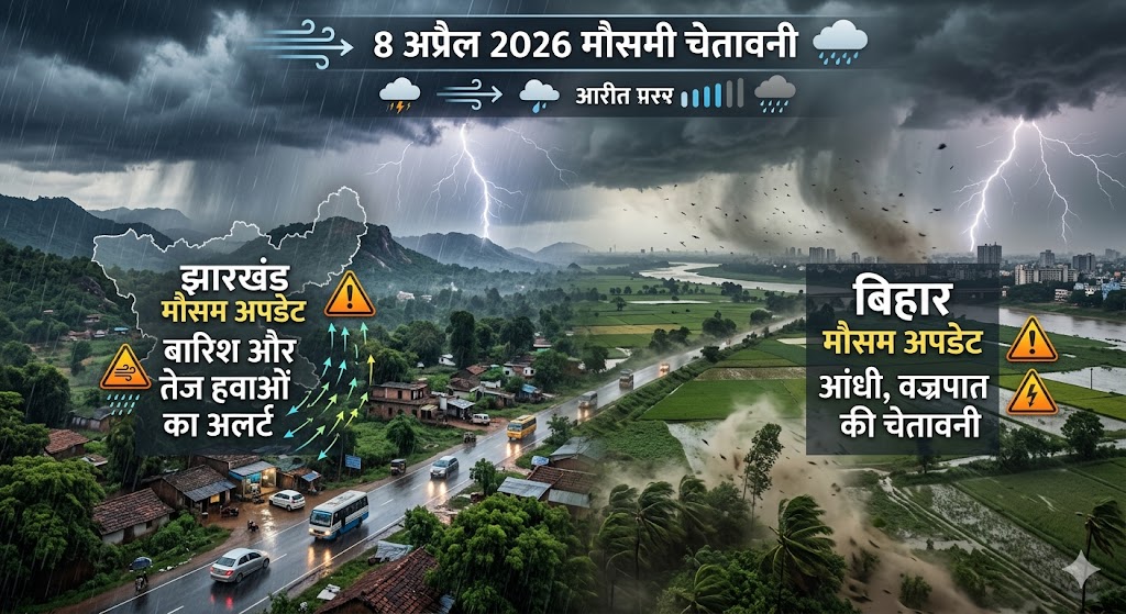 8 अप्रैल 2026 को झारखंड और बिहार में मौसम बदलने की संभावना है। मौसम विभाग ने आंधी, बारिश और तेज हवाओं का येलो-ऑरेंज अलर्ट जारी किया है। रांची, पटना और बोकारो समेत कई शहरों में तापमान में गिरावट और बादल छाए रहने की उम्मीद है।